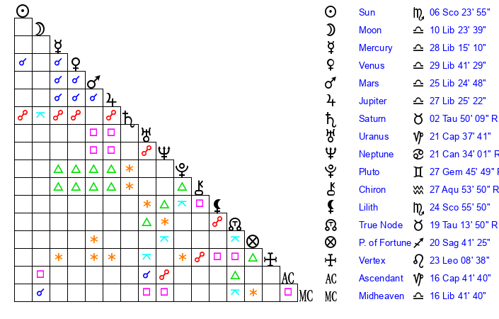 | Mercury | 28 Libra 16 | 25 Scorpio 38 | 12 Aquarius 10 |