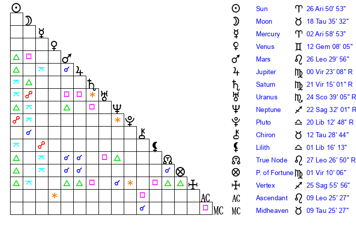 | Moon | 18 Taurus 39 | 7 Sagittarius 6 | 2 Capricorn 8 |
