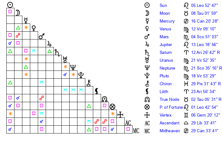 Moon | 7 Taurus 58 | 5 Libra 49 | 18 Gemini 14 |