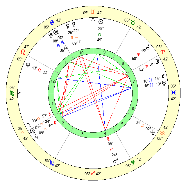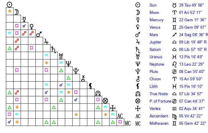 | Mercury | 22 Gemini 12 | 20 Taurus 54 | 29 Virgo 18 |