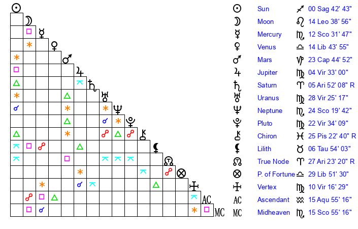 Pluto | 22 Virgo 34 | 0 Aquarius 4 | 22 Virgo 42 |