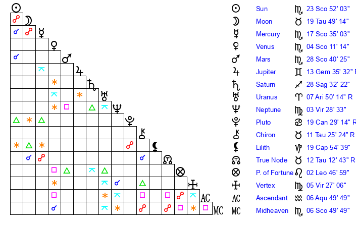 | Moon | 19 Taurus 45 | 15 Libra 38 | 5 Sagittarius 11 |