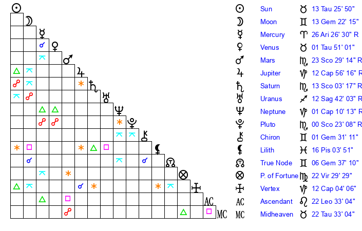 | Sun | 13 Taurus 26 | 13 Taurus 30 | 22 Gemini 51 |