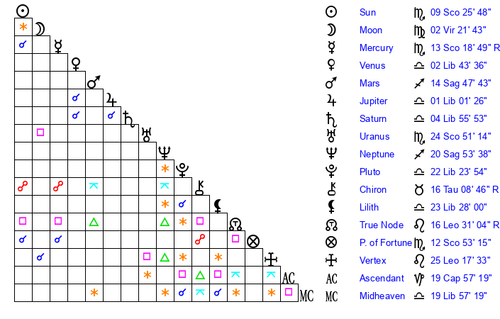 | Mercury | 13 Scorpio 18 | 3 Sagittarius 1 | 16 Sagittarius 44 |