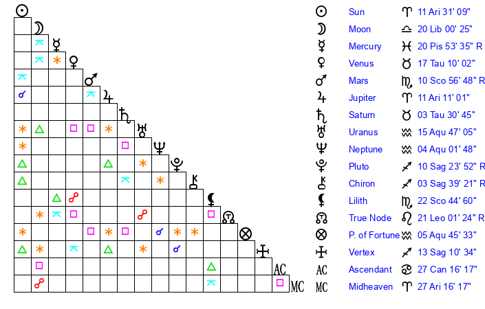 Moon | 19 Libra 53 | 27 Taurus 52 | 4 Libra 35 |