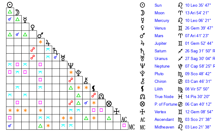 | Moon | 13 Aries 49 | 23 Scorpio 31 | 19 Leo 14 |