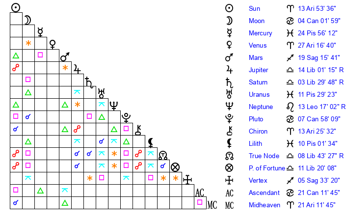 | Saturn | 4 Libra 14 | 24 Pisces 49 | 2 Libra 57 |