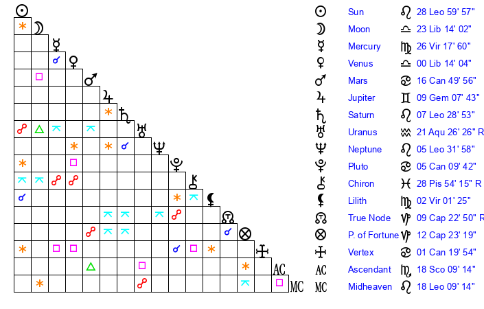 | Sun | 29 Leo 0 | 29 Leo 51 | 16 Sagittarius 3 |