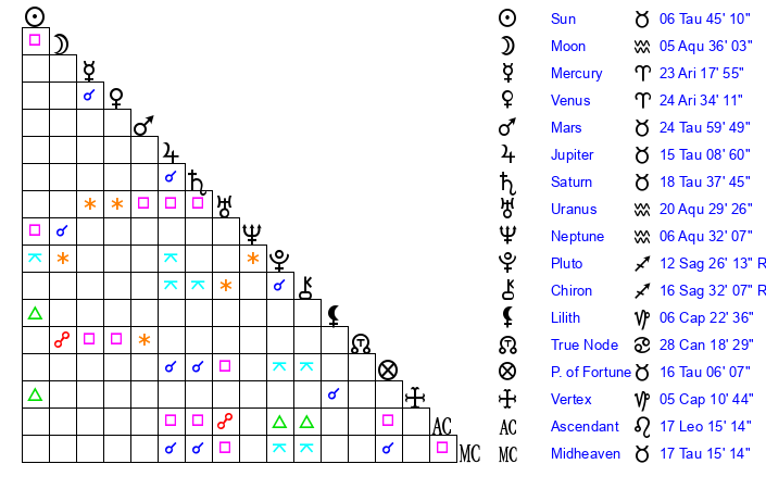Uranus | 20 Aquarius 29 | 26 Taurus 6 | 20 Aquarius 48 |