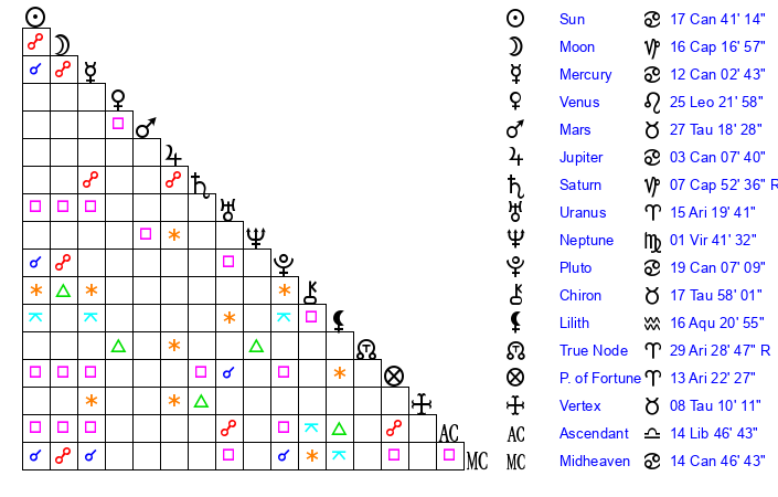 | Pluto | 19 Cancer 8 | 2 Aquarius 55 | 20 Cancer 52 |