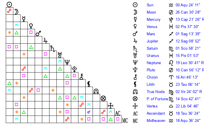 | Mars | 1 Sagittarius 14 | 24 Cancer 0 | 4 Aquarius 5 |