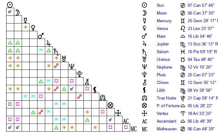 | Moon | 6 Cancer 27 | 15 Virgo 36 | 15 Libra 28 |