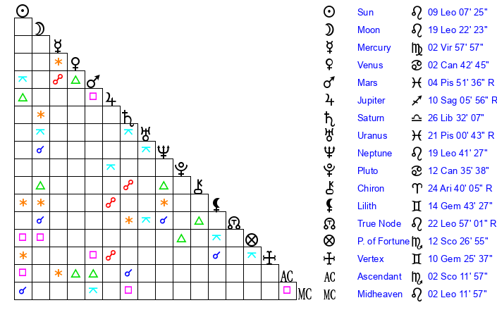 | Neptune | 19 Leo 41 | 1 Aries 57 | 22 Leo 31 |