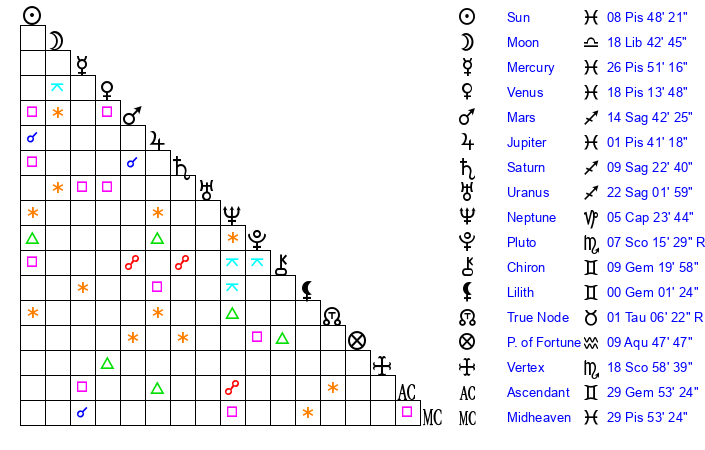 | Sun | 8 Pisces 48 | 9 Pisces 21 | 17 Aries 35 |