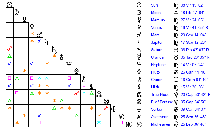 | Sun | 8 Virgo 19 | 9 Virgo 30 | 7 Sagittarius 34 |