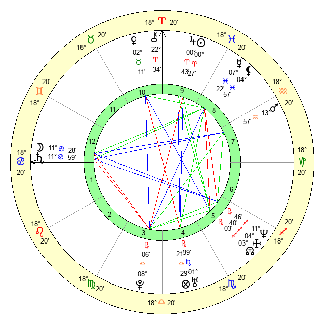 | Saturn | 12 Cancer 21 | 23 Pisces 10 | 15 Cancer 7 |