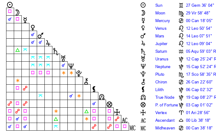 Sun | 27 Gemini 36 | 28 Gemini 21 | 0 Leo 1 |