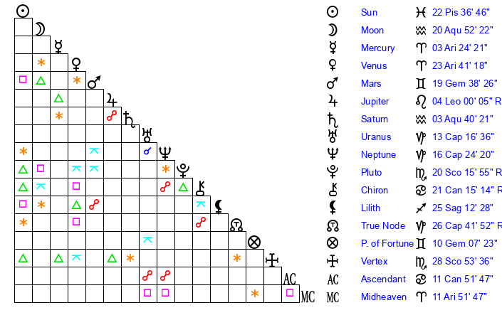 | Saturn | 3 Aquarius 40 | 22 Pisces 11 | 6 Aquarius 5 |