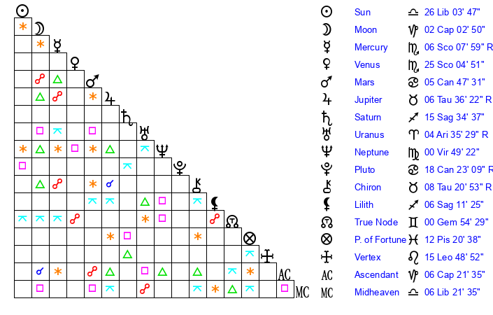 | Moon | 2 Capricorn 4 | 6 Libra 28 | 26 Cancer 17 |