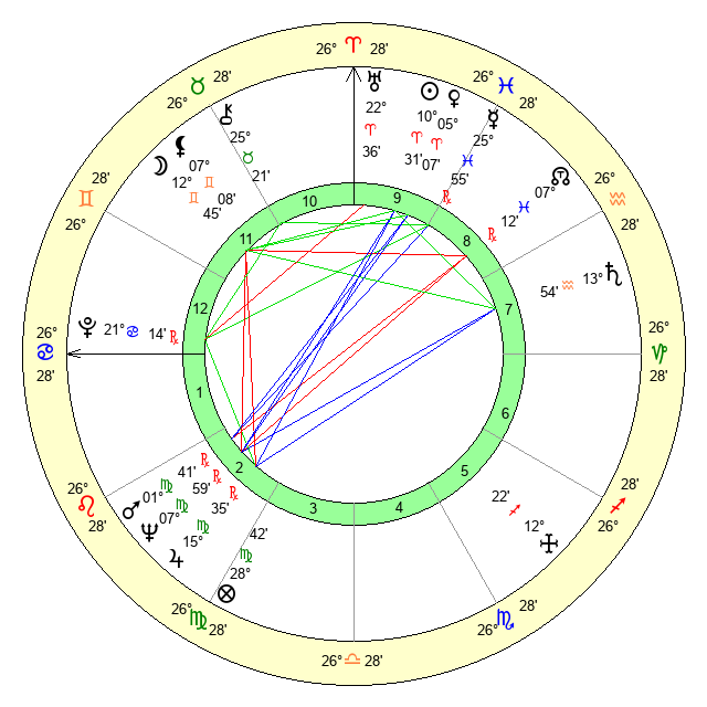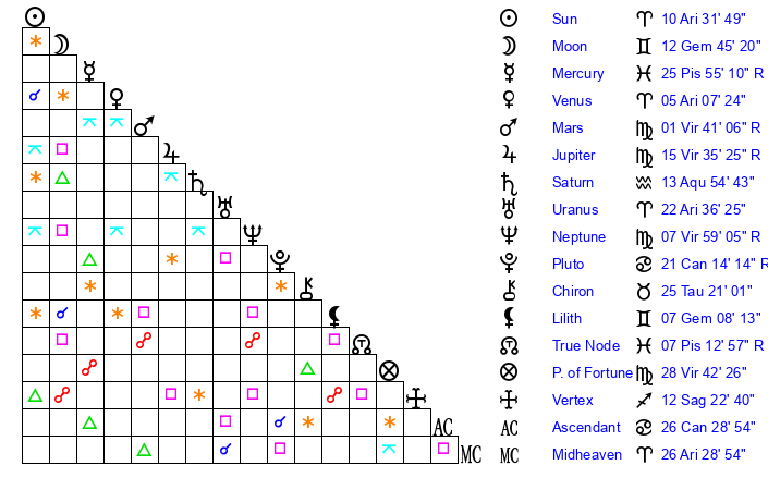 | Sun | 10 Aries 32 | 11 Aries 14 | 9 Cancer 22 |