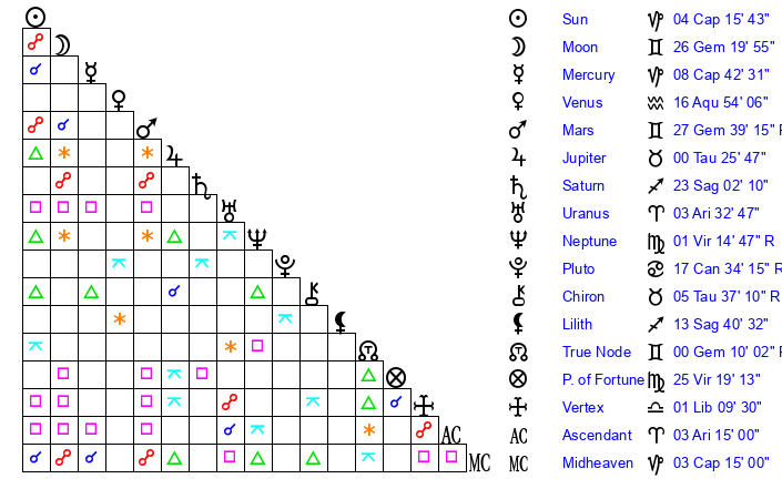 | Pluto | 17 Cancer 34 | 0 Aquarius 53 | 16 Cancer 13 |