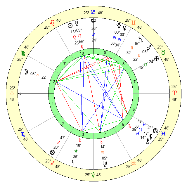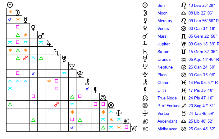 | Moon | 8 Libra 20 | 9 Capricorn 54 | 12 Scorpio 41 |