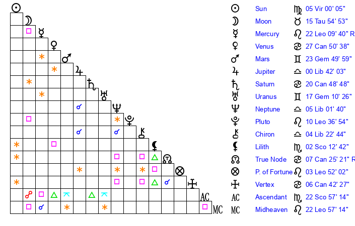 | Sun | 5 Virgo 0 | 5 Virgo 38 | 23 Scorpio 59 |