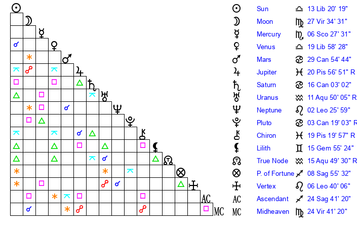| Moon | 27 Virgo 34 | 22 Aries 13 | 5 Libra 41 |