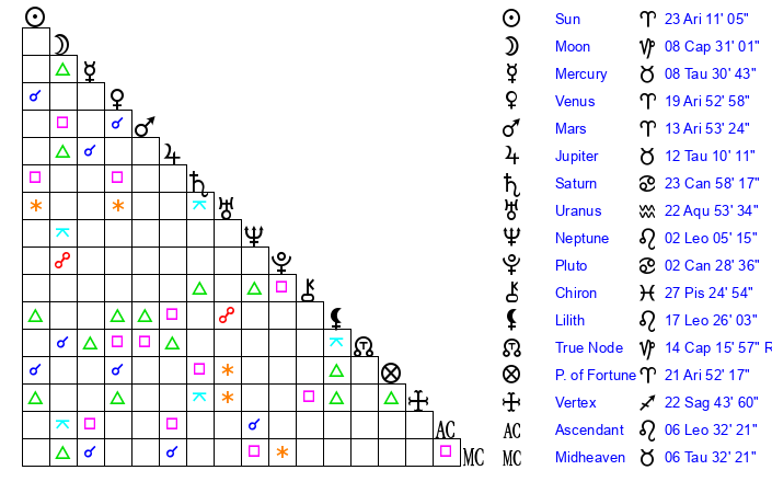| Sun | 23 Aries 11 | 24 Aries 1 | 6 Leo 55 |
