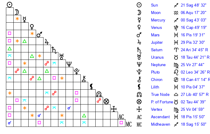 | Sun | 21 Sagittarius 48 | 22 Sagittarius 57 | 18 Pisces 59 |