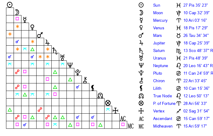 | Pluto | 11 Cancer 25 | 3 Aquarius 18 | 12 Cancer 51 |