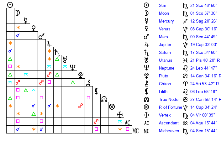 | Saturn | 18 Scorpio 3 | 25 Pisces 13 | 26 Scorpio 27 |