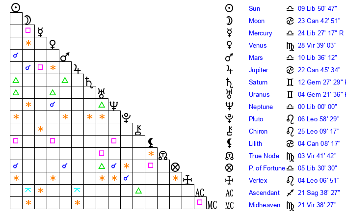 | Mercury | 24 Libra 27 | 25 Libra 26 | 17 Capricorn 0 |