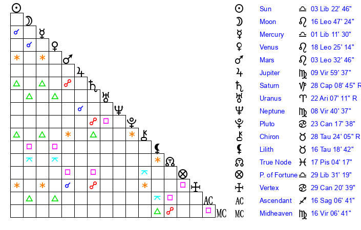 | Neptune | 8 Virgo 41 | 0 Aries 39 | 10 Virgo 6 |