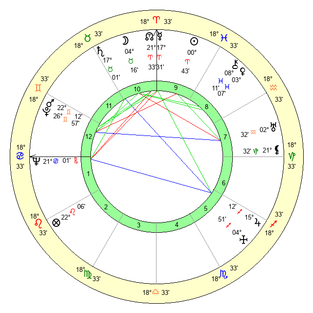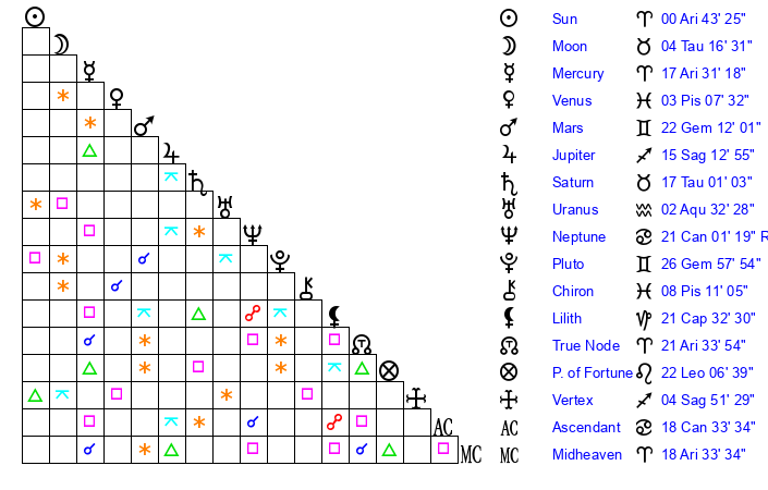 Sun | 0 Aries 43 | 1 Aries 20 | 19 Cancer 56 |