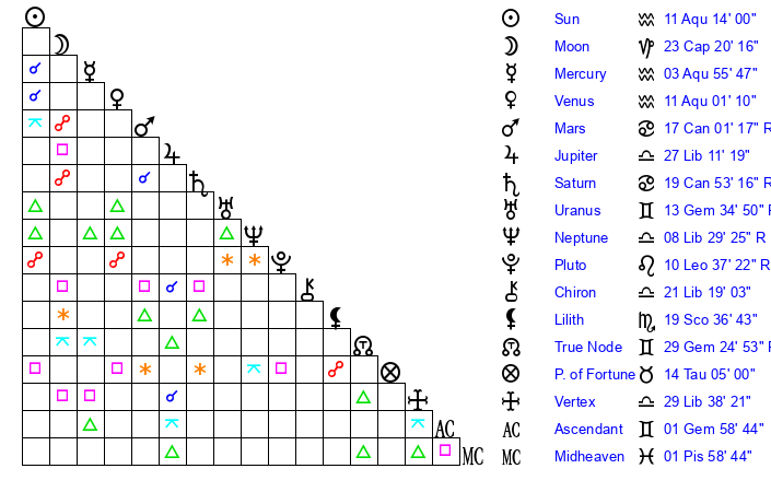 | Neptune | 8 Libra 29 | 27 Pisces 57 | 6 Libra 38 |