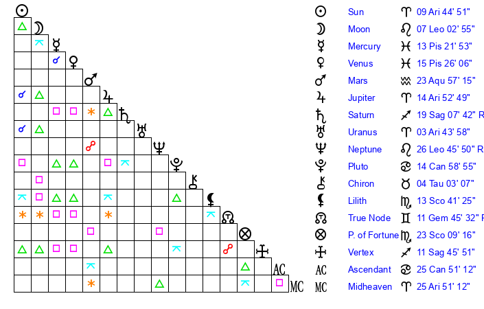 | Moon | 7 Leo 5 | 27 Aries 55 | 13 Aquarius 36 |
