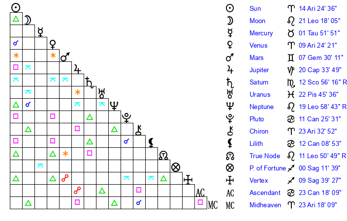 | Neptune | 19 Leo 58 | 0 Aries 11 | 21 Leo 8 |