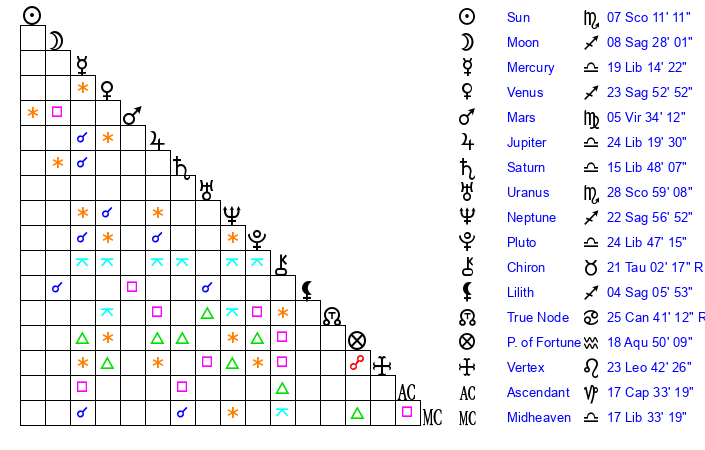 | Sun | 7 Scorpio 11 | 7 Scorpio 31 | 21 Sagittarius 37 |