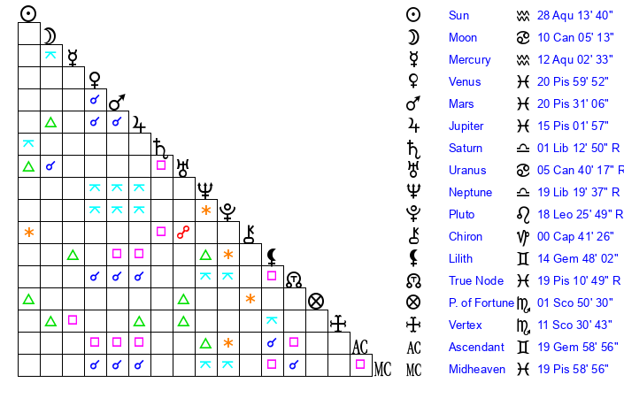 | Neptune | 19 Libra 19 | 28 Pisces 29 | 17 Libra 31 |