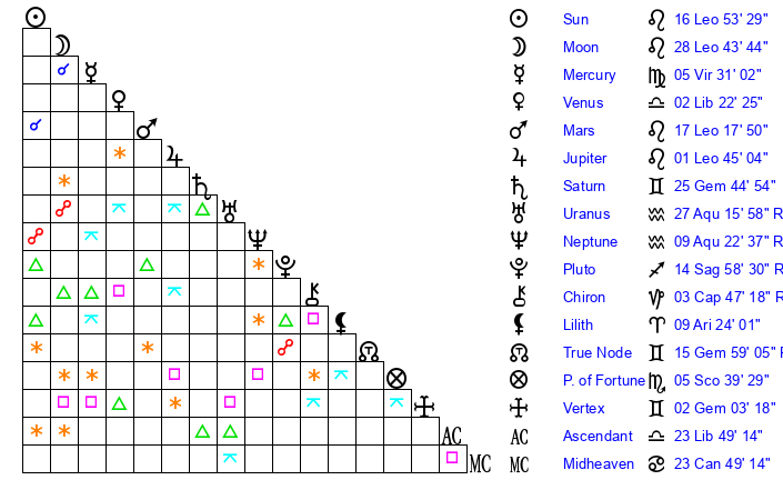 Moon | 28 Leo 41 | 21 Aquarius 35 | 27 Gemini 3 |