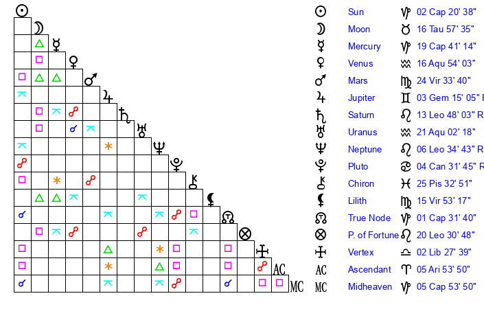 | Moon | 16 Taurus 59 | 22 Libra 30 | 13 Aries 13 |