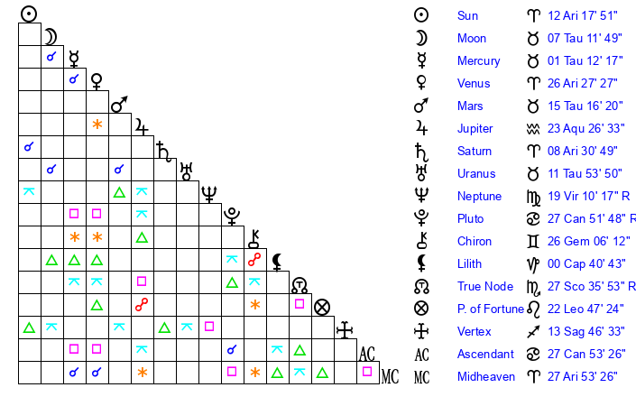 | Sun | 12 Aries 17 | 13 Aries 12 | 6 Cancer 19 |