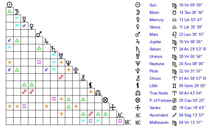Sun | 19 Virgo 0 | 19 Virgo 12 | 15 Scorpio 21 |