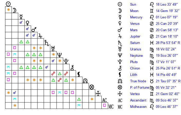 Sun | 18 Leo 34 | 19 Leo 16 | 15 Libra 57 |