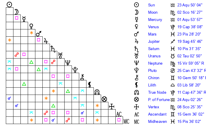 | Neptune | 15 Virgo 58 | 28 Pisces 21 | 14 Virgo 1 |