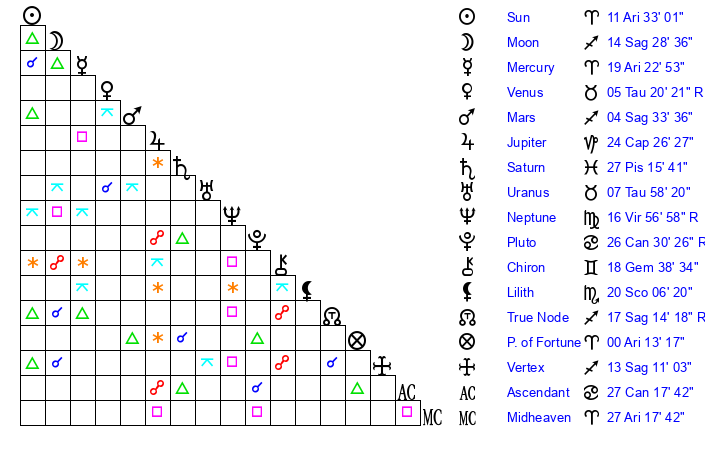 | Sun | 11 Aries 33 | 12 Aries 13 | 6 Cancer 33 |