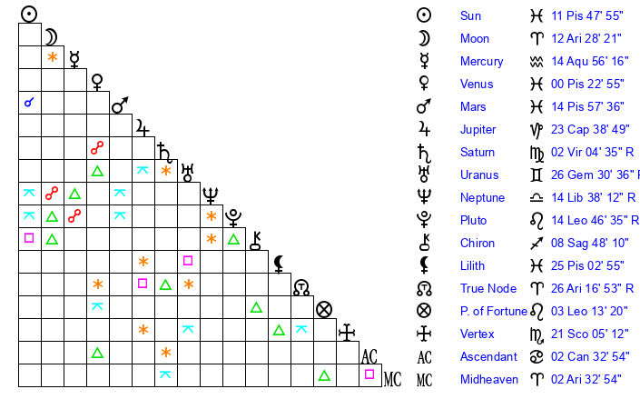 | Moon | 12 Aries 27 | 19 Aries 6 | 2 Aquarius 33 |
