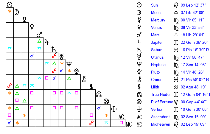Venus | 8 Virgo 34 | 1 Cancer 47 | 19 Scorpio 41 |