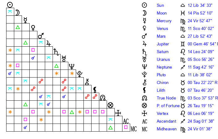 | Mercury | 24 Virgo 52 | 28 Libra 30 | 10 Sagittarius 44 |